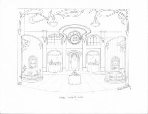 My inspiration for the “She Loves Me” set was the very brief style period of Art Nouveau, which was especially popular in Paris and Eastern Europe in the teens and twenties. Since it takes place in an established Budapest perfumeries in the 1930s, it seemed like a perfect stylistic choice. Art Nouveau is characterized by asymmetrical, flowing lines, inspired by flowers and vines, and its lush, romantic character seemed fitting for this charming, romantic story.